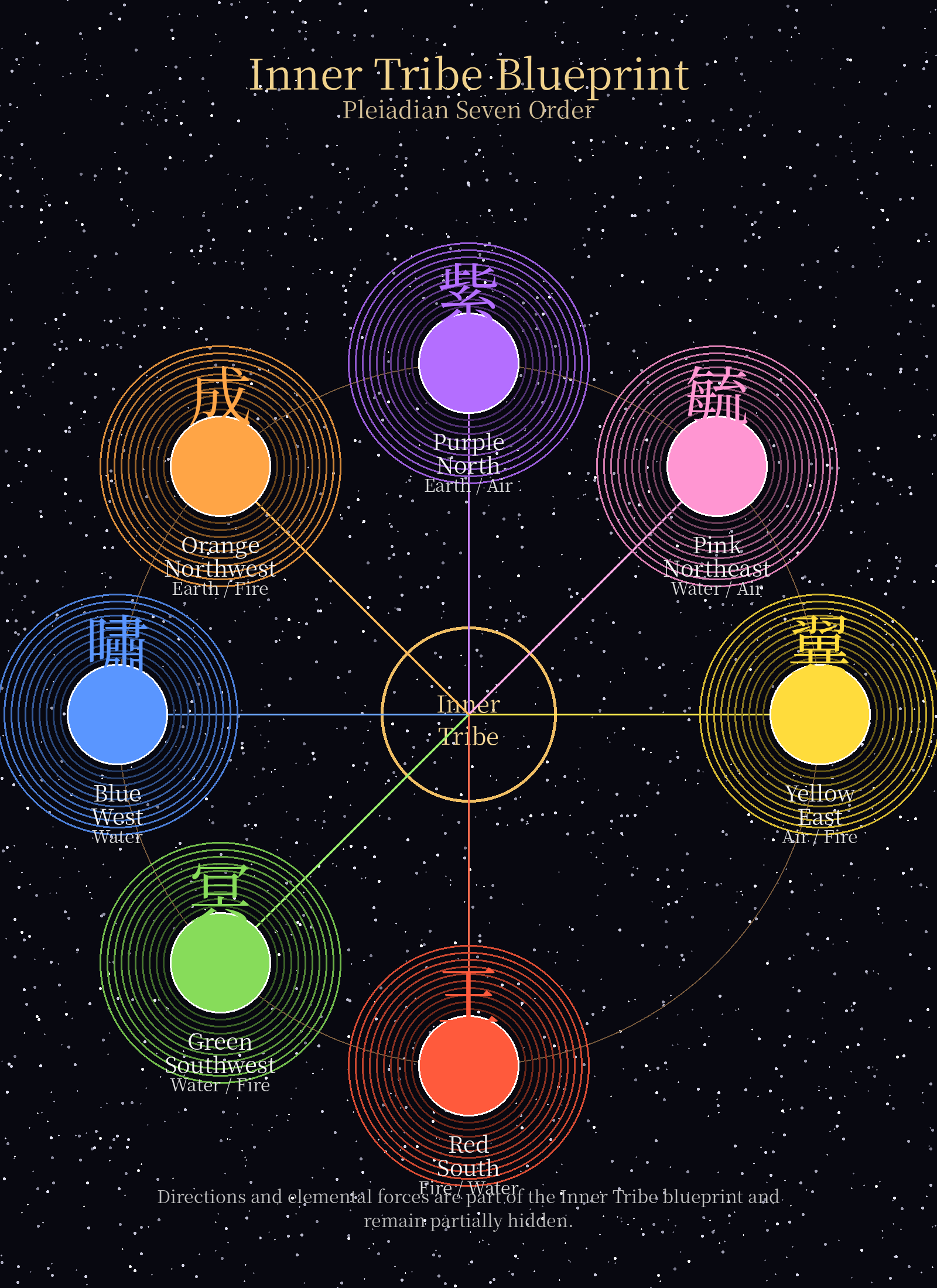 Within the Pleiadian Seven Order, seven members carry distinct energetic frequencies. Each color represents a role within the tribe and is expressed through a sacred character (紫 , 嘯 , 毓 , 冥 , 翼 ,成, 王) , a direction, and an elemental force. Together they form a balanced structure through which vision, creativity, transformation, and action flow as one unified system.